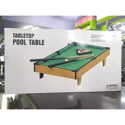Pool Table – Table Top- Pool Table, 15 Colored Balls, 1 Cue Ball, 2 Pool Sticks, 1 Cube Of Chalk and Triangle, with small Stand